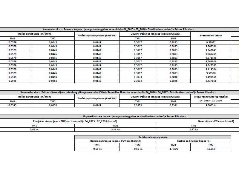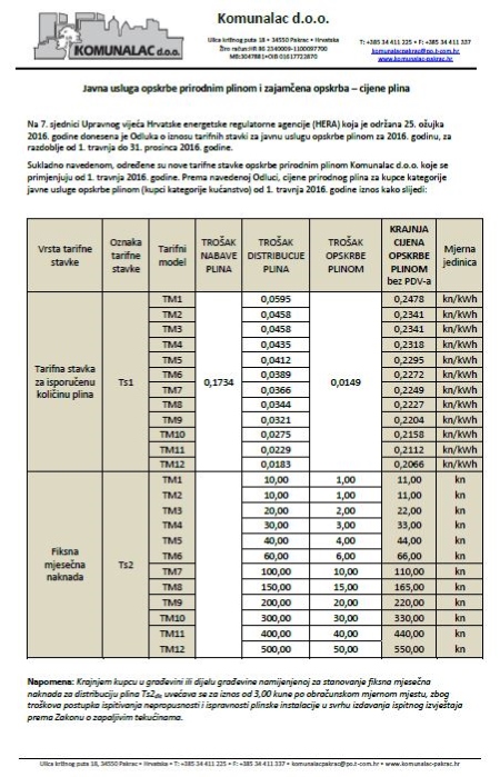 Prema navedenoj Odluci, cijene prirodnog plina za krajnje kupce koje opskrbljuje Komunalac d.o.o. Pakrac od 1. travnja 2016. godine iznose kako slijedi:
