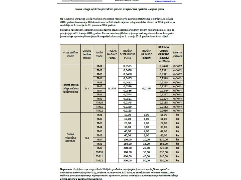 Nastavno na obavijest Hrvatske energetske regulatorne agencije (HERA) obavještavamo kupce plina da su na temelju Odluke o iznosu tarifnih stavki za javnu uslugu opskrbe plinom za razdoblje od 1. travnja do 31. prosinca 2016. na snazi nove cijene javne usluge opskrbe plinom za krajnje kupce. Nove cijene donesene su za sve opskrbljivače u obvezi javne usluge i primjenjuju se od 1. travnja 2016. godine.