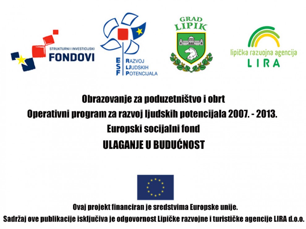 Navedene aktivnosti dio su projekta kojeg provodi Grad Lipik, partner na projektu je Lipička razvojna i turistička agencija LIRA d.o.o. Ukupna vrijednost projekta je 100.566,00 kn, od čega je 95% financirano od strane EU, iz Europskog socijalnog fonda (ESF), Operativnog programa Razvoj ljudskih potencijala 2007.-2013. Cilj projekta je promocija poduzetništva te lokalnih poduzetnika i obrtnika. Svrha projekta je poticanje poduzetničke kulture u društvu te razvoj pozitivnog odnosa prema cjeloživotnom učenju u poduzetništvu radi rasta i razvoja poduzetništva te povećanja stope samozapošljavanja i zapošljavanja.