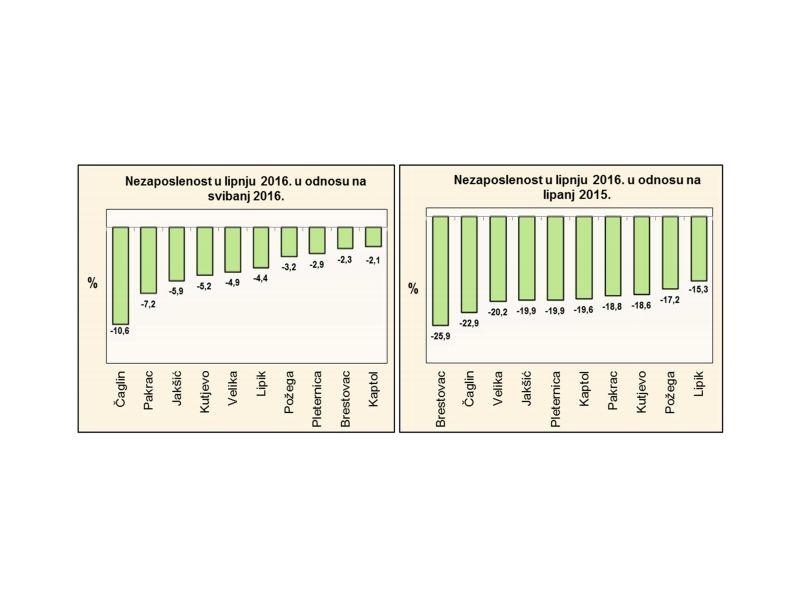 U lipnju je u odnosu na prethodni mjesec broj nezaposlenih smanjen u svim jedinicama lokalne uprave (najviše u općini Čaglin, za 10,6%, a najmanje u općini Kaptol, za 2,1%). U odnosu na lipanj 2015. evidentirana je nezaposlenost također manja u svim gradovima i općinama, od 15,3% u Lipiku do 25,9% u općini Brestovac. Na području cijele županije u ukupnom broju nezaposlenih žene čine 55,5% (2.193 osobe), a muškarci 44,5% (1.757 osoba). U odnosu na prethodni mjesec udio nezaposlenih žena je povećan, a muškaraca smanjen za 0,7 postotnih bodova, a u odnosu na lipanj 2015. udio žena je manji, a muškaraca veći za 0,4 postotna boda. Najveći udio žena u ukupnom broju nezaposlenih osoba je na području općine Jakšić (65,5%), a najmanji u Lipiku (44,3%).