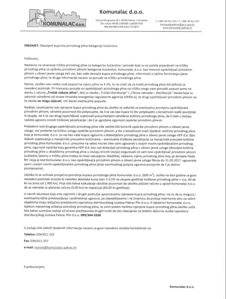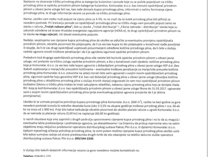 „Nastavno na otvaranje tržišta prirodnog plina za kategoriju kućanstvo i ponude koje su se počele pojavljivati na tržištu prirodnog plina za opskrbu prirodnim plinom kategorije kućanstvo, Komunalac d.o.o. kao trenutni opskrbljivač prirodnim plinom u obvezi javne usluge želi vas, kao naše domaće kupce prirodnoga plina, informirati o načinu formiranja cijene prirodnoga plina, te druge informacije vezano za ponude na tržištu prirodnoga plina.