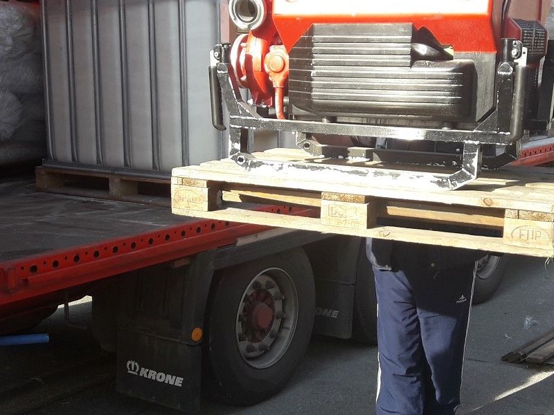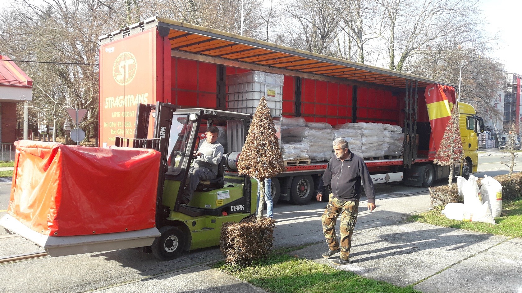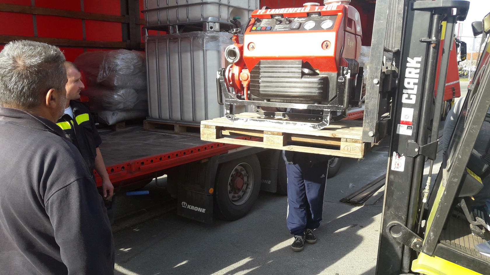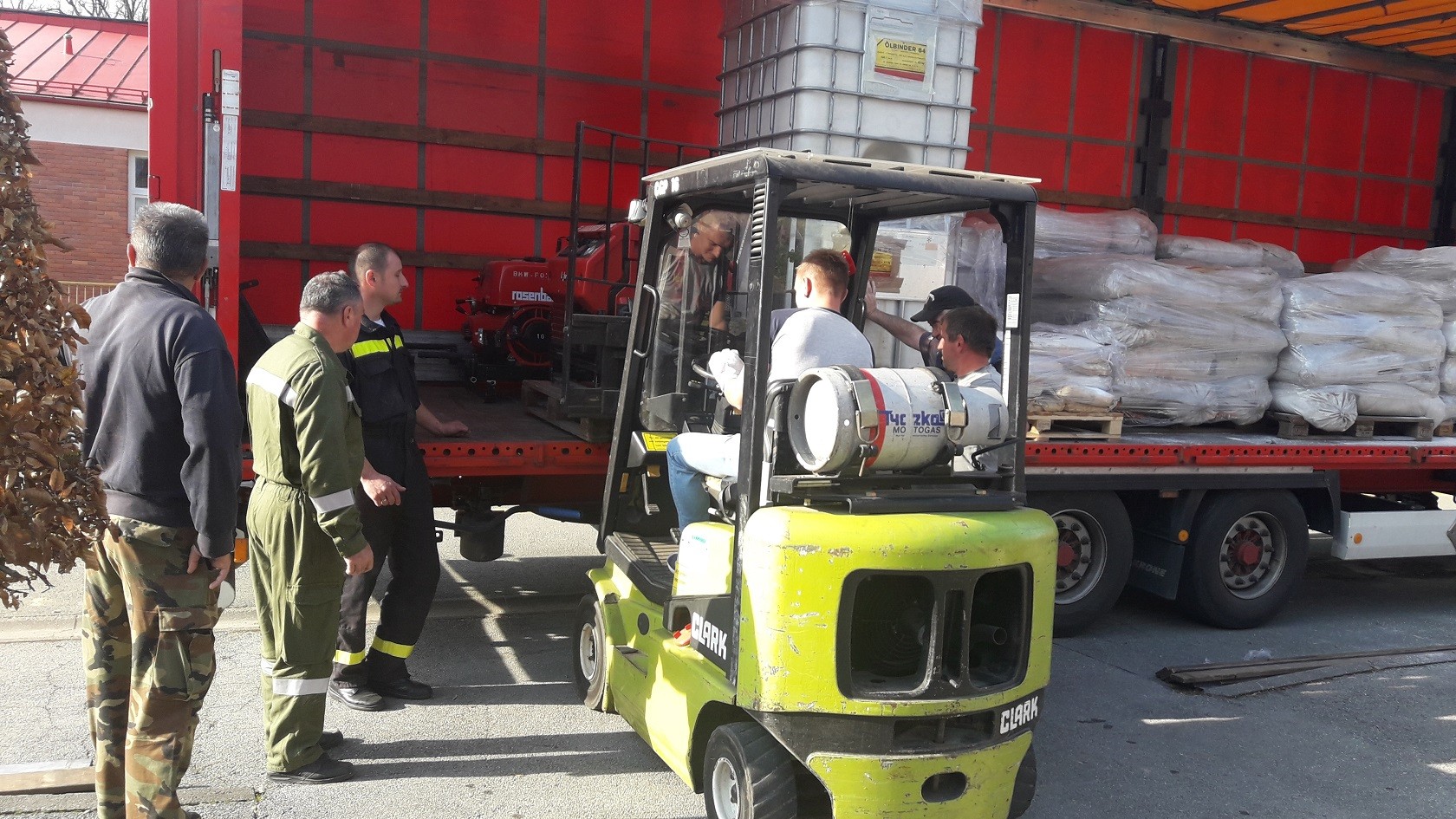 Uz vatrogasnu opremu u ovoj donaciji iz Tirola stigao je viličar koji je doniran Gradu Lipiku, a odmah je poslužio za istovar opreme iz kamiona.