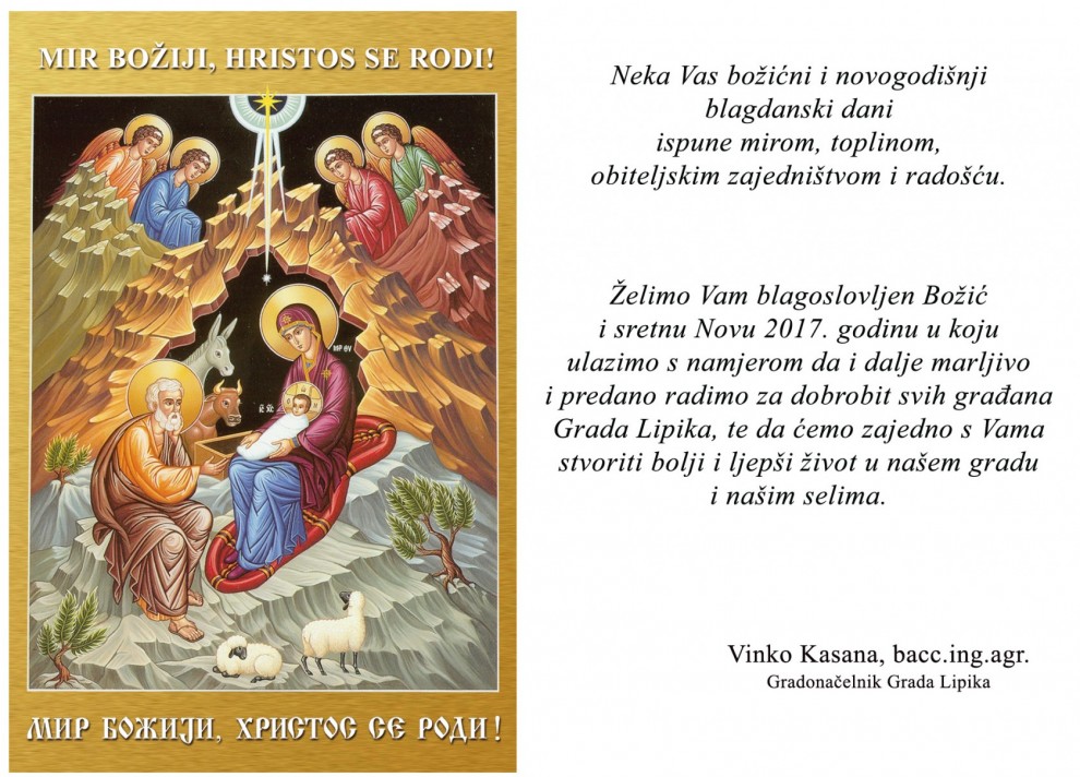 Želim vam blagoslovljen Božić i sretnu novu 2017. hodinu u koju ulazimo s namjerom da i dalje marljivo i predano radimo za dobrobit svih građana Grada Lipika, te da ćemo zajedno s vama stvoriti bolji i ljepši život u našem gradu i našim selima.