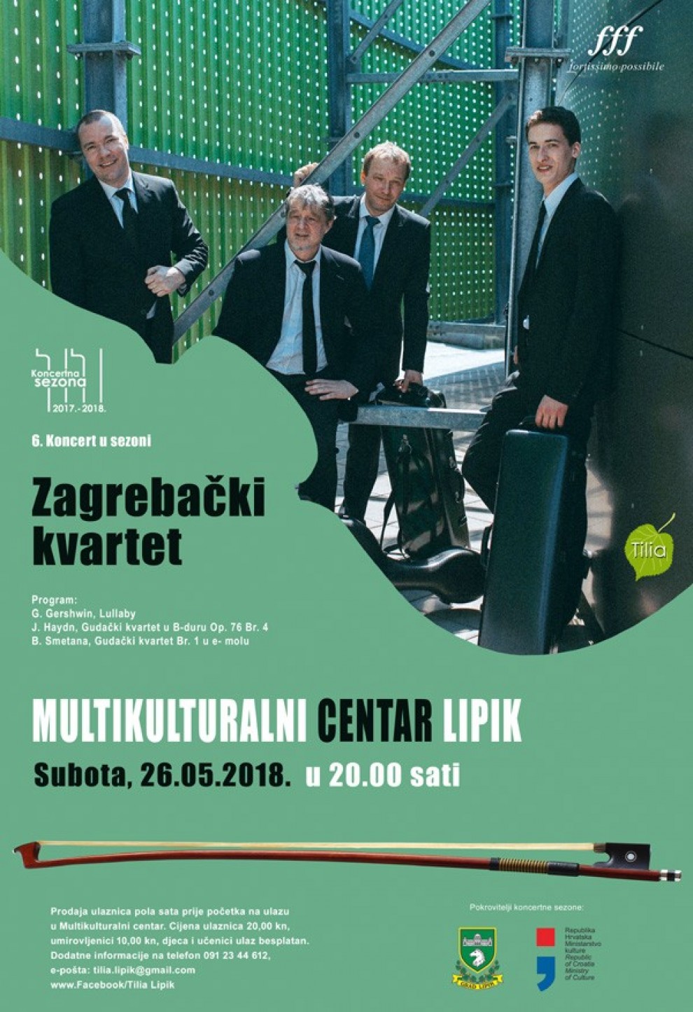 Šestim redovitim koncertom, u subotu 26. svibnja 2018. nastavlja se XI. Koncertna sezona u Lipiku. Nastupiti će Zagrebački kvartet, nekima poznatiji kao Zagrebački gudački kvartet, sa skladbama G. Gershwina, J. Hajdna i B. Smetane.