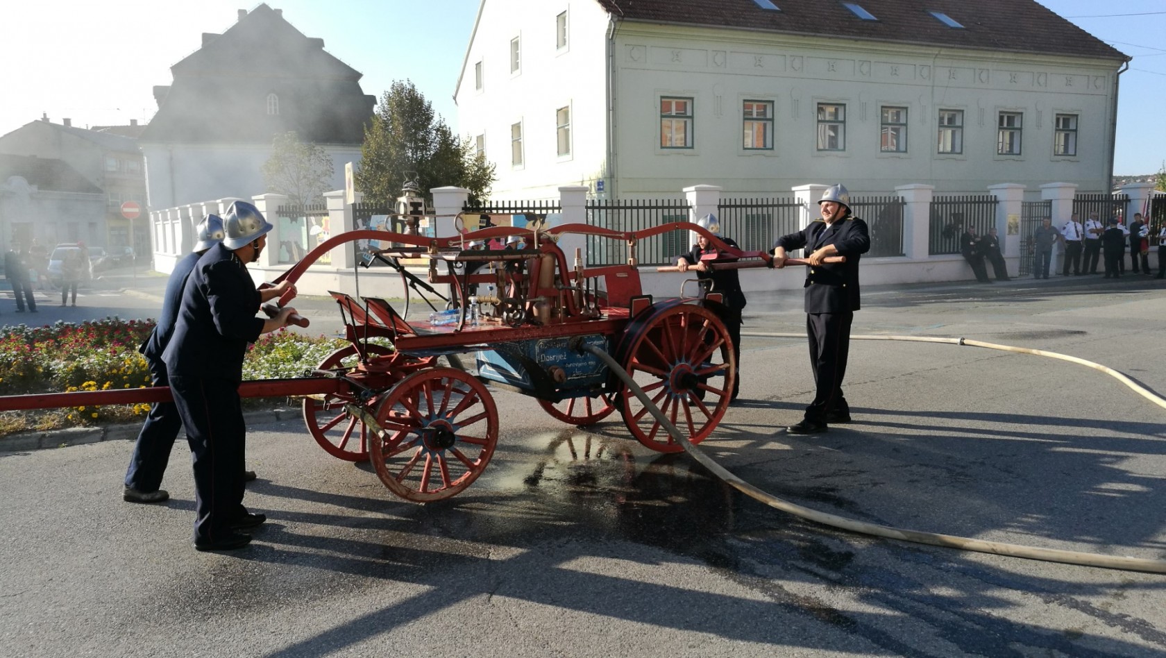 Po otpustu, vatrogascima i okupljenim građanima, demonstrirano je improvizirano gašenje požara pomoću zaprežnog vatrogasnog vozila DVD-a Donja Obrijež koje datira iz 1907. godine kao vrijedni eksponat minulog vremena koji je i danas upotrebljiv zahvaljujući temeljitom održavanju i obnovi 1943. i 2007. godine. Demonstraciju gašenja požara metodama otprije stotinu godina izveli su pripadnici DVD-a Prekopakra koje je predvodio zapovjednik Bruno Skalnik i koje je okupljeno građanstvo nagradilo zasluženim pljeskom.
