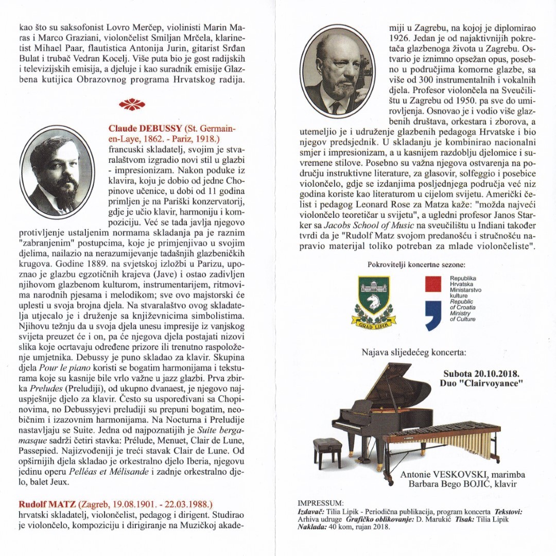 Na koncertu u spomen Claudea Debussy-ja povodom 100. obljetnice njegove smrti i Rudolfa Matza povodom 30. obljetnice smrti zaljubljenici u klasičnu glazbu mogli su poslušati odlične izvedbe klasičnih djela ovog francuskog skladatelja i impresionista te našeg skladatelja, violončelista, pedagoga i dirigenta za kojeg tvrde da je „možda najveći violončelo teoretičar na svijetu“.