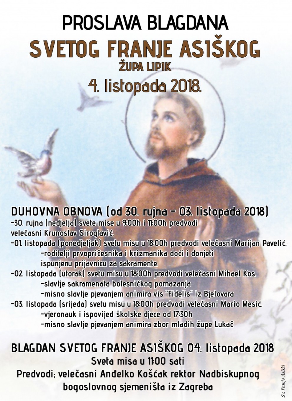 3. listopada (srijeda) svetu misu u 18h predvodi velečasni Mario Mesić; vjeronauk i ispovijed školske djece od 17:30h; misno slavlje pjevanjem animira zbor mladih župe Lukač