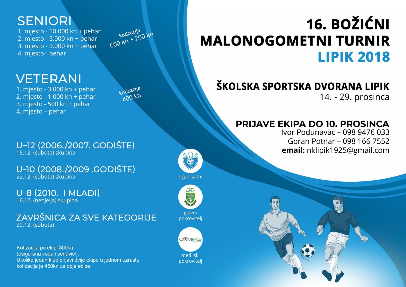 U organizaciji NK Lipik 1925 i ove godine se održava tradicionalni 16. Božićni malonogometni turnir Lipik 2018. koji će se igrati od 14. do 29. prosinca 2018. u Školskoj sportskoj dvorani Lipik (*neće se održavati između 23. i 26. prosinca).