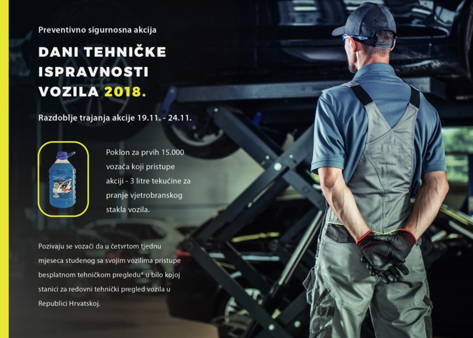Akcija će se provoditi od 19. (ponedjeljak) do 24. (subota) studenog ove godine. U tom periodu bit će omogućen besplatni tehnički pregled svim vlasnicima vozila koji se sa svojim vozilima pojave u bilo kojoj stanici za redovni tehnički pregled vozila u Republici Hrvatskoj (osim onim vlasnicima čija su vozila u terminu redovnog tehničkog pregleda u tom razdoblju).