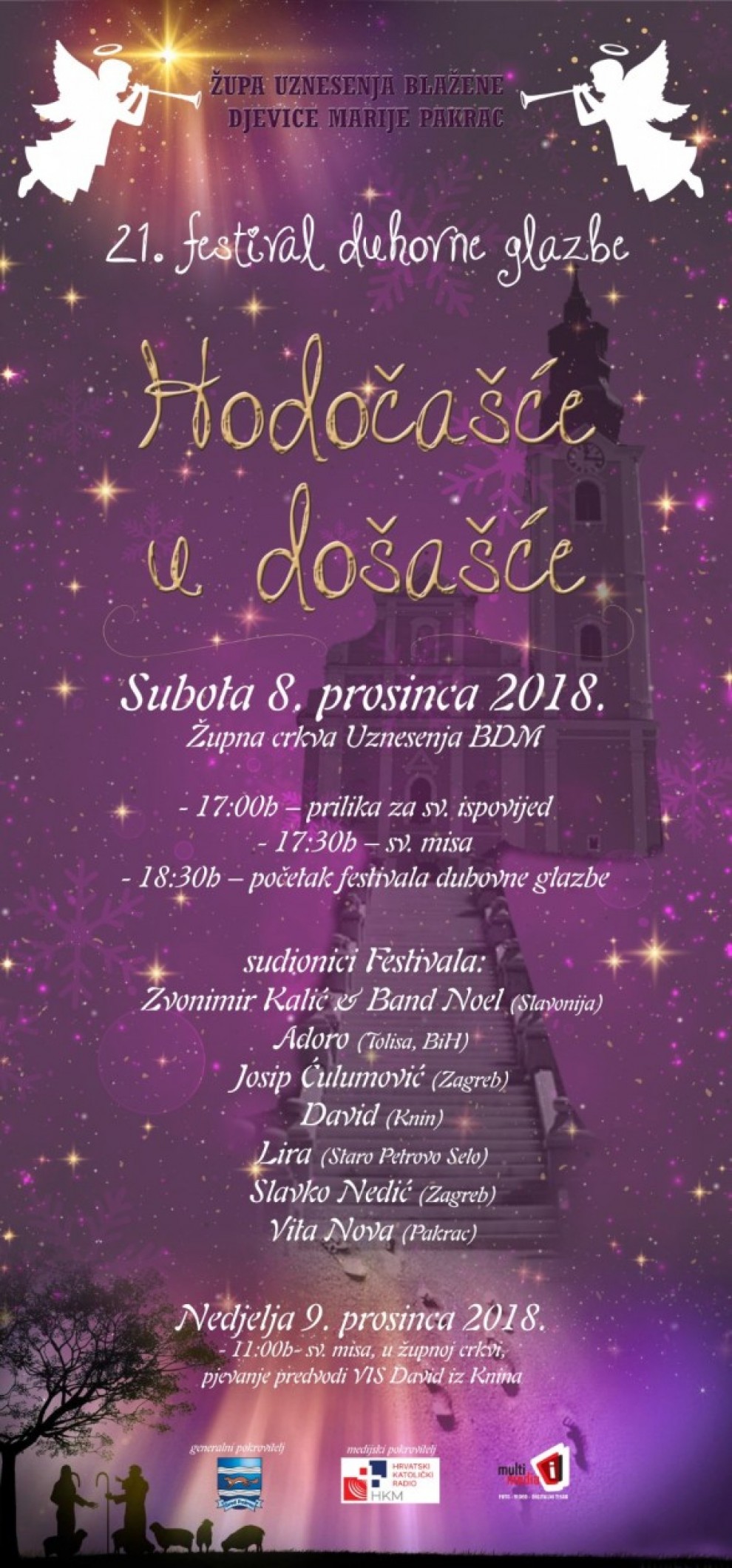 Župna crkva Uznesenja BDM u Pakracu u subotu 8. prosinca bit će mjesto održavanja 21. po redu festivala duhovne glazbe „HODOČAŠĆE U DOŠAŠĆE“ kojeg zajednički organiziraju pakračka župa i glazbena skupina „Vita Nova”, a pod pokroviteljstvom Grada Pakraca.