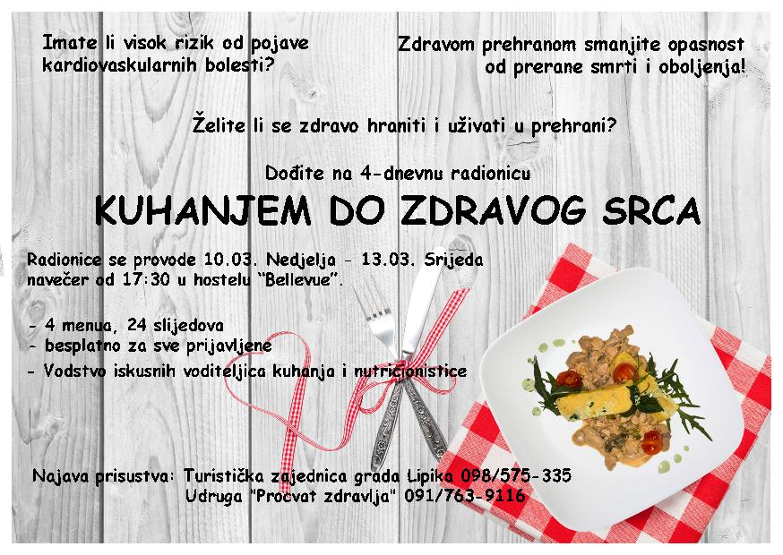 "Izlagači s Dana zdravlja u Lipiku 2018. organiziraju četverodnevnu besplatnu edukaciju - radionicu kuhanja zdrave prehrane "Hranom do zdravog srca". To je udruga za promicanje i očuvanje zdravlja, kako fizičkog tako emocionalnog i duhovnog. U tom pravcu provode različite aktivnosti kao što su edukativna predavanja, degustacije, radionice, vježbaonice i igraonice za djecu i odrasle. Na području Istre imaju mnogo uspješno ostvarenih edukacija. U tom sklopu su i radionice kuhanja koje bismo htjeli organizirati u Lipiku. Radionicom se želi potaknuti konzumiranje zdravih namirnica i educirati stanovništvo kako da pripremaju obroke veganske kuhinje. U Lipik dolaze prvi put i u suradnji s Turističkom zajednicom grada Lipika i Gradom Lipikom će biti organiziran jedan ciklus od 4 edukativne radionice.", rekao je voditelj Turističkog ureda Hrvoje Kovačić.