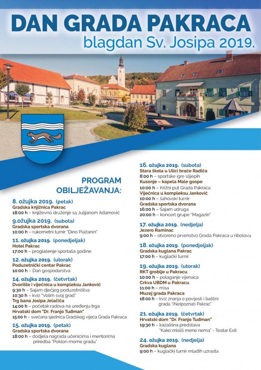 U utorak 19.3., na sam blagdan sv. Josipa, zaštitnika Pakraca, u župnoj crkvi Uznesenja Blažene Djevice Marije će od 11 sati biti služena sveta misa kojoj će prethoditi polaganje vijenaca i paljenje svijeća na Spomen obilježju na pakračkom groblju, a u znak sjećanja na sve poginule i umrle hrvatske branitelje. U popodnevnim satima, točnije od 18, u Muzeju grada Pakraca bit će organiziran zanimljiv kviz znanja o povijesti i baštini grada pod nazivom „(Ne)poznati Pakrac“.