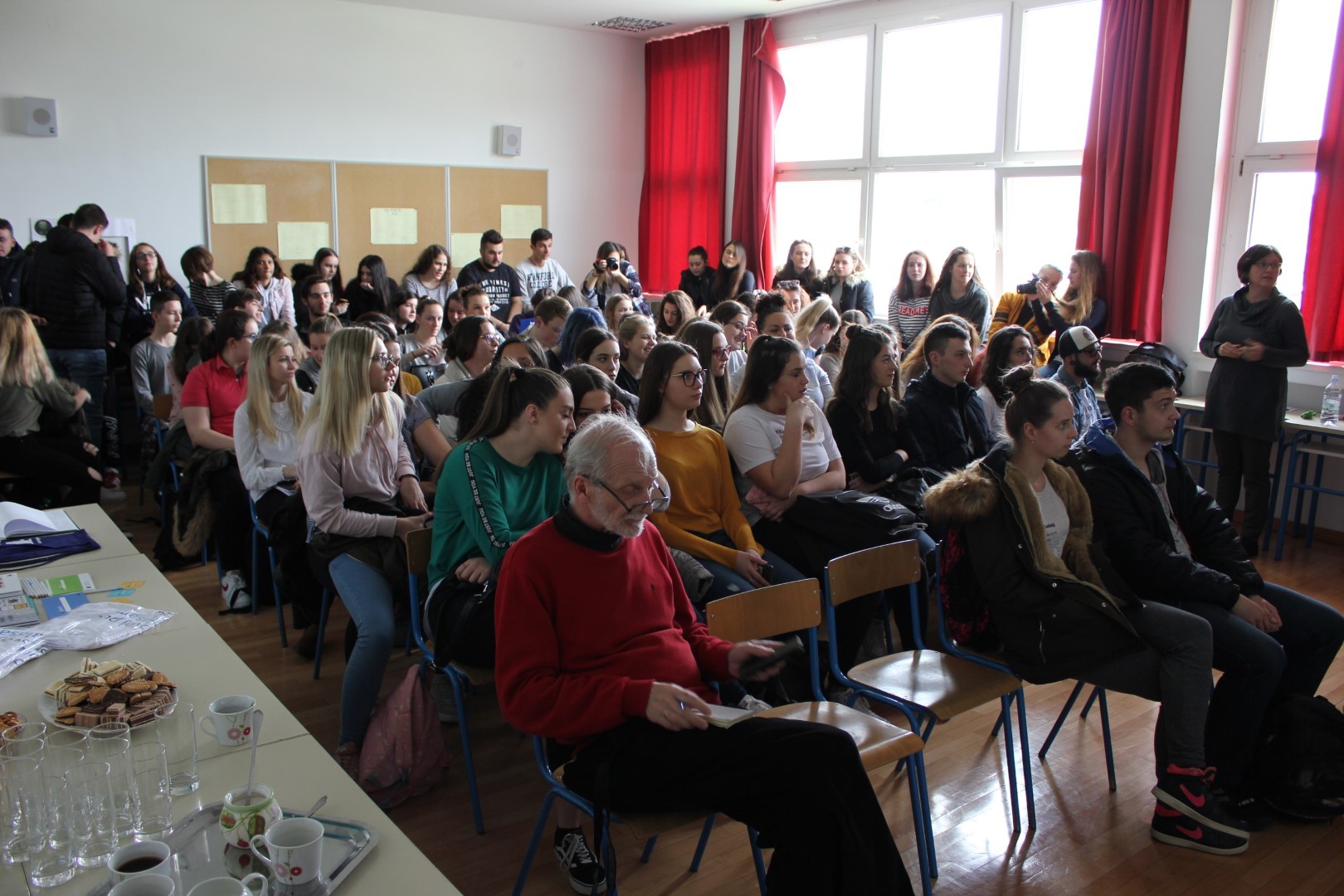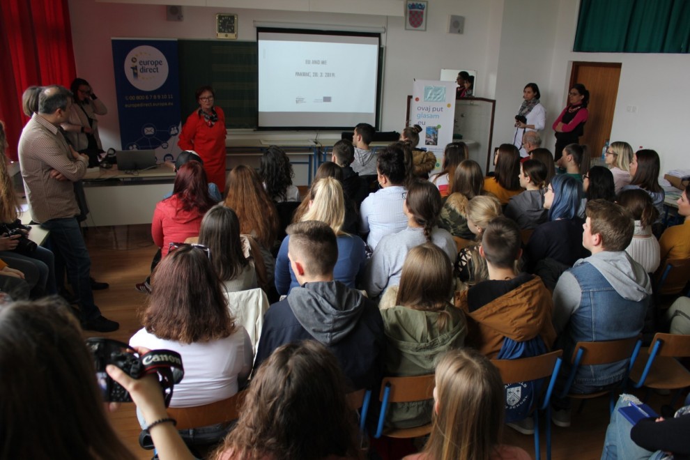 Iako je za predavanje bila predviđena najveća školska učionica ona je i dalje bila premalena za sve srednjoškolke i srednjoškolce koji su došli poslušati kakve im se mogućnosti kao mladima otvaraju u okviru programa i projekata Europske unije. Božica Sedlić otvorila je današnje predavanje uvodom u svrhu i djelovanje informacijskog centra EUROPE DIRECT, a nastavila je s kvizom o EU u kojem su srednjoškolci mogli testirati svoje znanje o Europskom parlamentu, izbornim procesima koji vode u njega i kako i zašto glasovati za zastupnike u EU parlamentu, tko ima pravo sudjelovati ali i tko su naši predstavnici u njemu. Iva Sedlić nastavila je prezentacijom EURODESK mreže, i programa SNAGA SOLIDARNOSTI te isprezentirala koje sve mladi imaju mogućnosti stjecanja znanja i iskustava u projektima i organizacijama u okviru EU, a i šire, volontiranjem, stažiranjem, radom i razmjenom.