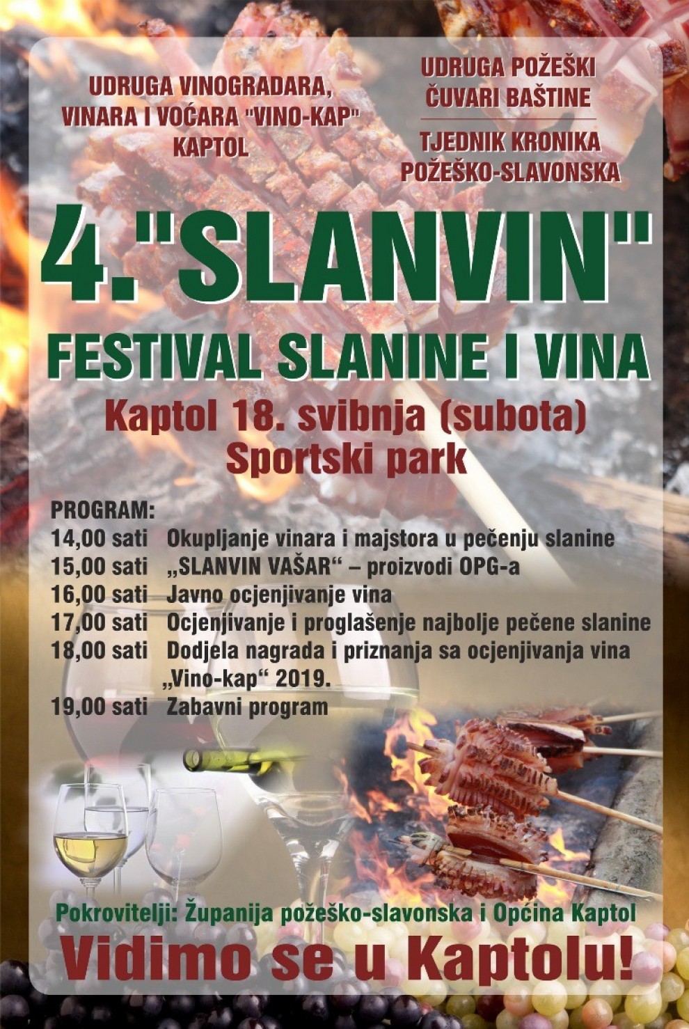 Tjednik KRONIKA požeško-slavonska i Udruga Požeški čuvari baštine organizira po 4. puta gastro manifestaciju "Festival slanine i vina Slanvin", natjecanje majstora u pečenju slanine, koja će se održati u subotu, 18. svibnja od 16 sati, u Sportskom centru Kaptol.