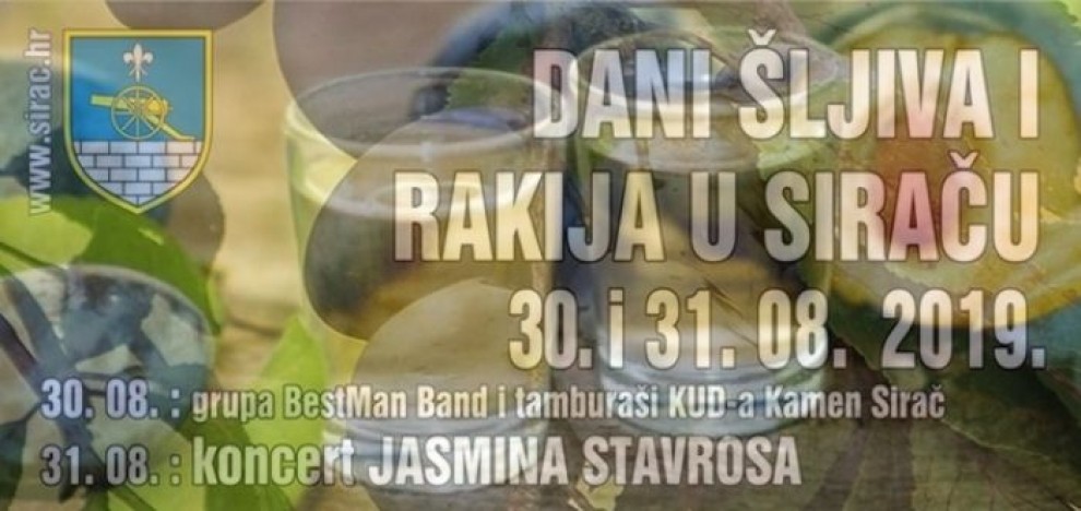 Jedinstvena poljoprivredno-kulturno-turistička manifestacija "Dani šljiva i rakija u Siraču" koja iz godine u godinu mirisom svih mogućih domaćih proizvoda od šljiva privlači veliki broj posjetitelja održat će se u 30. i 31. kolovoza 2019. godine u Parku Osnovne škole Sirač.
