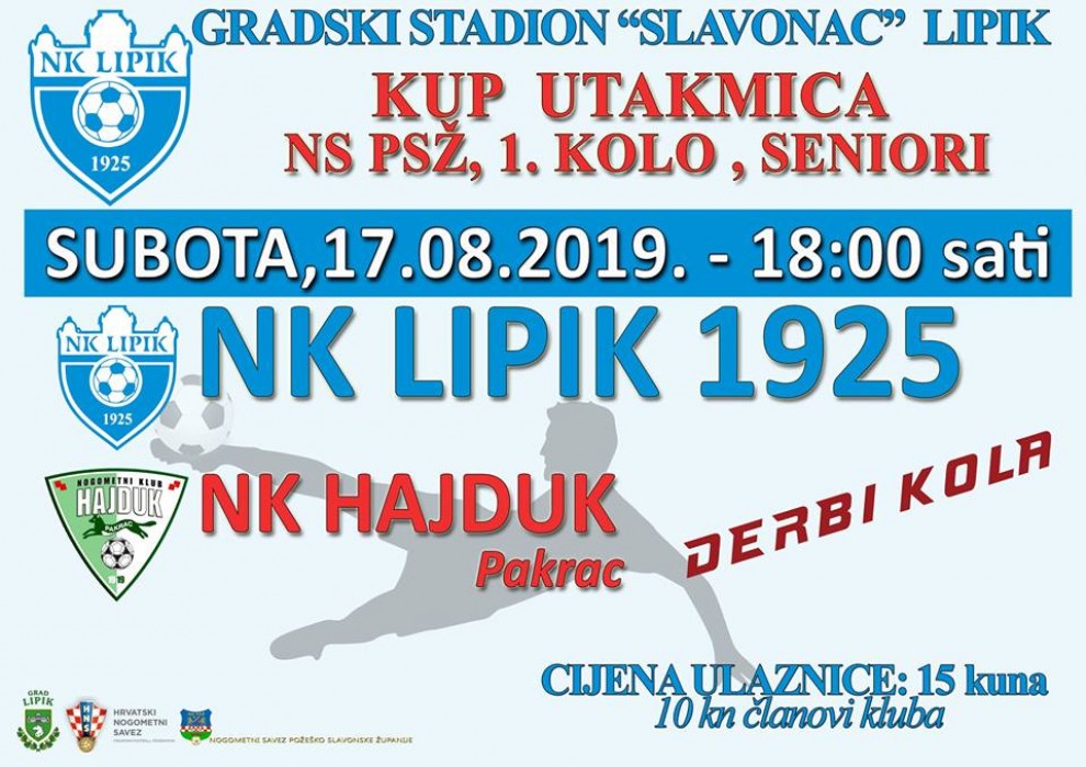 U sklopu 1. kola kupa NS PSŽ na lipičkom nogometnom stadionu u subotu, 17. kolovoza, s početkom u 18 sati odigrat će se veliki derbi između između NK Lipik 1925 i NK Hajduk Pakrac. Utakmica će ujedno poslužiti i kao odličan test za obje momčadi pred nadolazeću sezonu koja počinje vikend iza ovog ogleda.