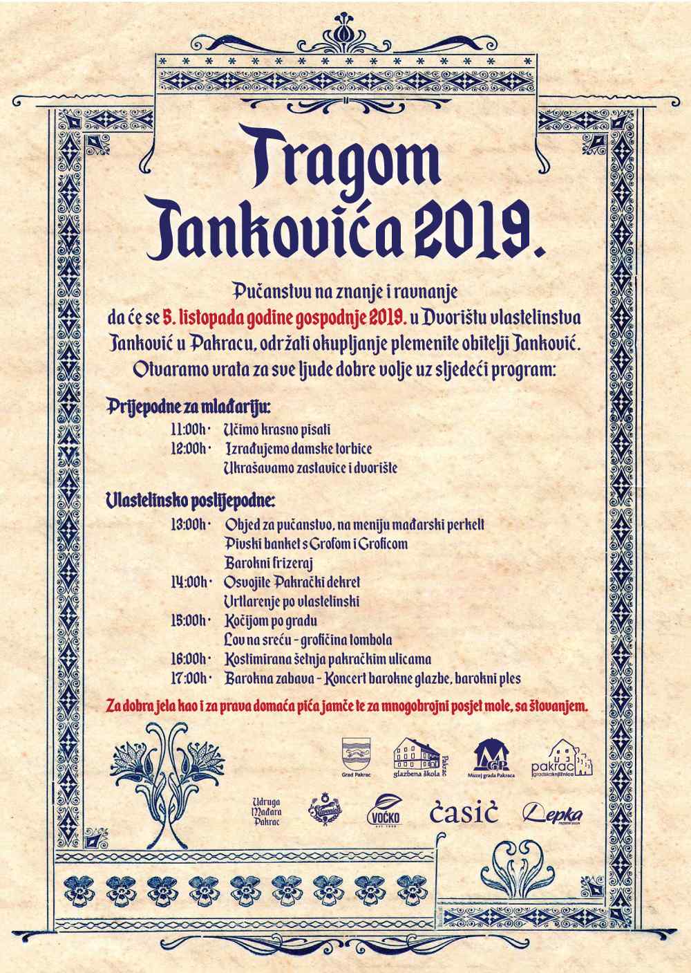 „Ove godine po drugi put organiziramo događanje "Tragom Jankovića" kroz koje ćemo pokušati oživjeti povijest ove obitelji i vrijeme njihova življenja na ovom prostoru. Pakračko vlastelinstvo je u posjedu obitelji Janković bilo od 1760.-1861. i u tom razdoblju je ovaj kraj znatno unaprijeđen u gospodarskom, kulturnom i društvenom pogledu. Stoga je povijest ove obitelji duboko utkana u povijest ovoga prostora. Cijeli događaj će se odvijati u jedinstvenoj i zaštićenoj kulturno - povijesnoj cjelini Dvorišta Janković iz 18.stoljeća koje je samo po sebi prekrasna "kulisa" za ovo događanje.“, rekla je ravnateljica pakračkog Muzeja Jelena Hihlik te dodala da je u Pakracu očuvano cijelo središte nekadašnjeg pakračkog vlastelinstva (obuhvaćalo je Pakrac i Lipik te više od trideset okolnih sela). Uz dvorac odnosno kuriju Janković, gdje su članovi obitelji stanovali kada su prebivali u Pakracu, očuvana je i zgrada za smještaj uprave vlastelinstva (Mali dvor Janković) te dvije gospodarske zgrade što je jedinstveni primjer, jer nigdje u Slavoniji uz zgrade za stanovanje nisu očuvane i zgrade ovog tipa.