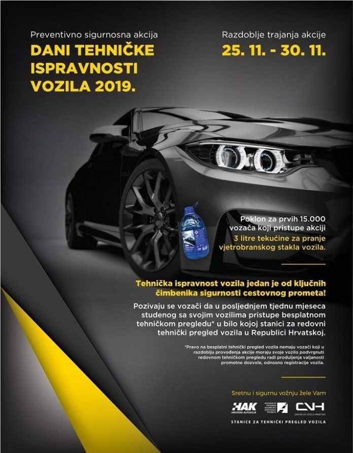 Preventivno-sigurnosna akcija nadzora tehničke ispravnosti vozila pod nazivom "Dani tehničke ispravnosti vozila 2019" provoditi će se od 25. do 30. studenoga u svim stanicama za redovni tehnički pregled vozila u Hrvatskoj.