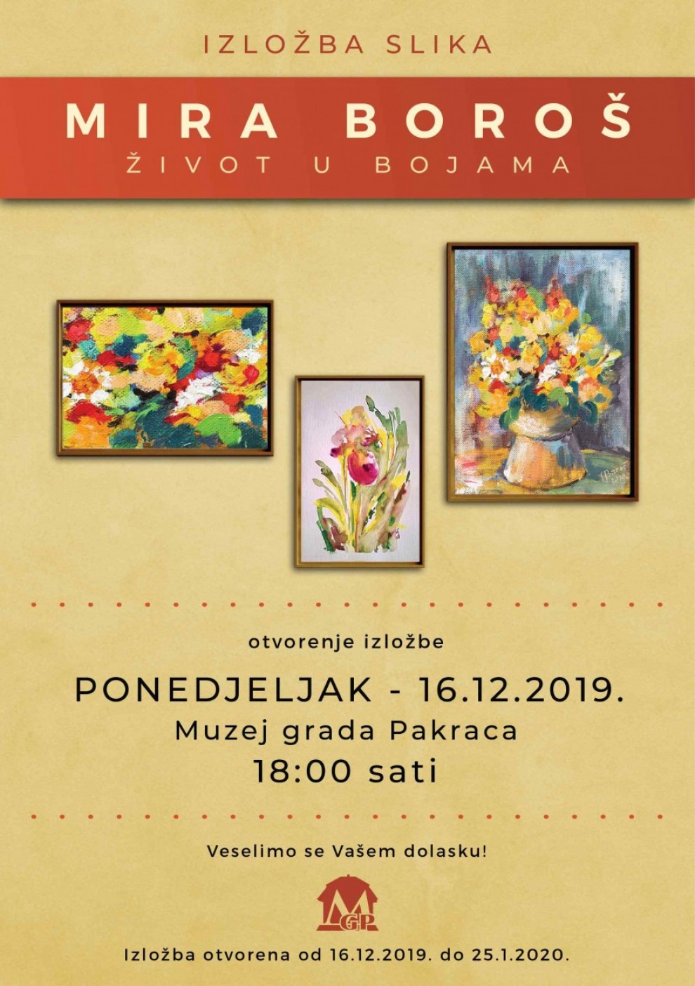 U Muzeju Grada Pakraca danas u 18 sati će se održati posljednja ovogodišnja izložba „Život u bojama“ kojom će se predstaviti slikarica Mira Boroš.