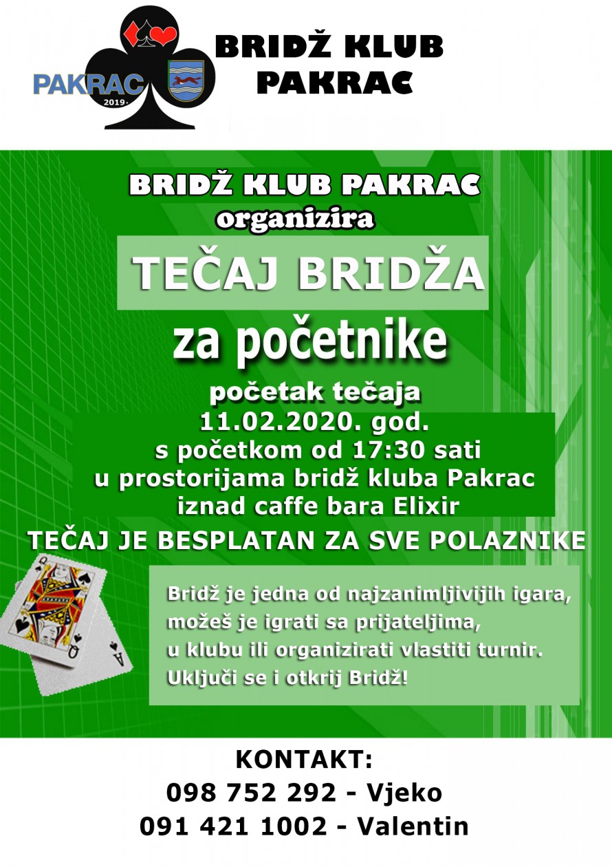 Početak tečaja predviđen je za utorak 11. veljače u 17:30 sati u prostorijama Bridž kluba Pakrac (iznad Caffe bara Elixir; ulaz sa stražnje strane).