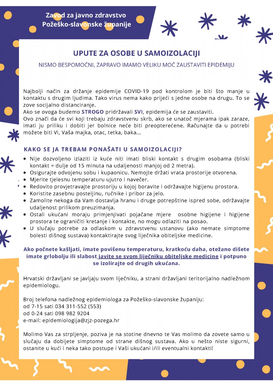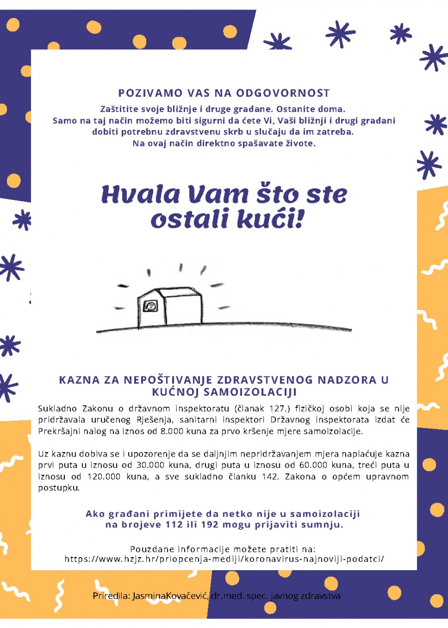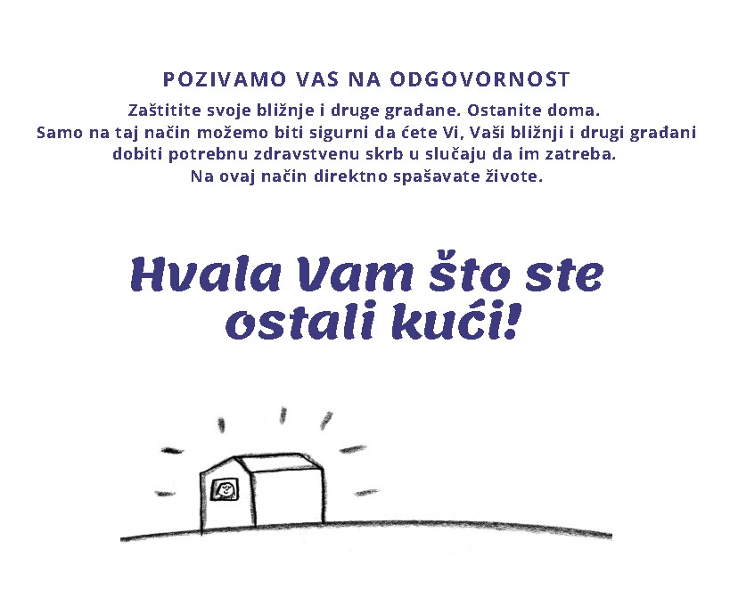 Građani RH nisu nemoćni u suzbijanju ove bolesti, baš naprotiv, imaju veliku moć zaustaviti epidemiju! Stoga se moli građanstvo, a posebno osobe starije od 60 godina i kronične bolesnike da se pridržavaju priloženih uputa kako bi se epidemija COVID-19 stavila pod kontrolu i zaustavila.