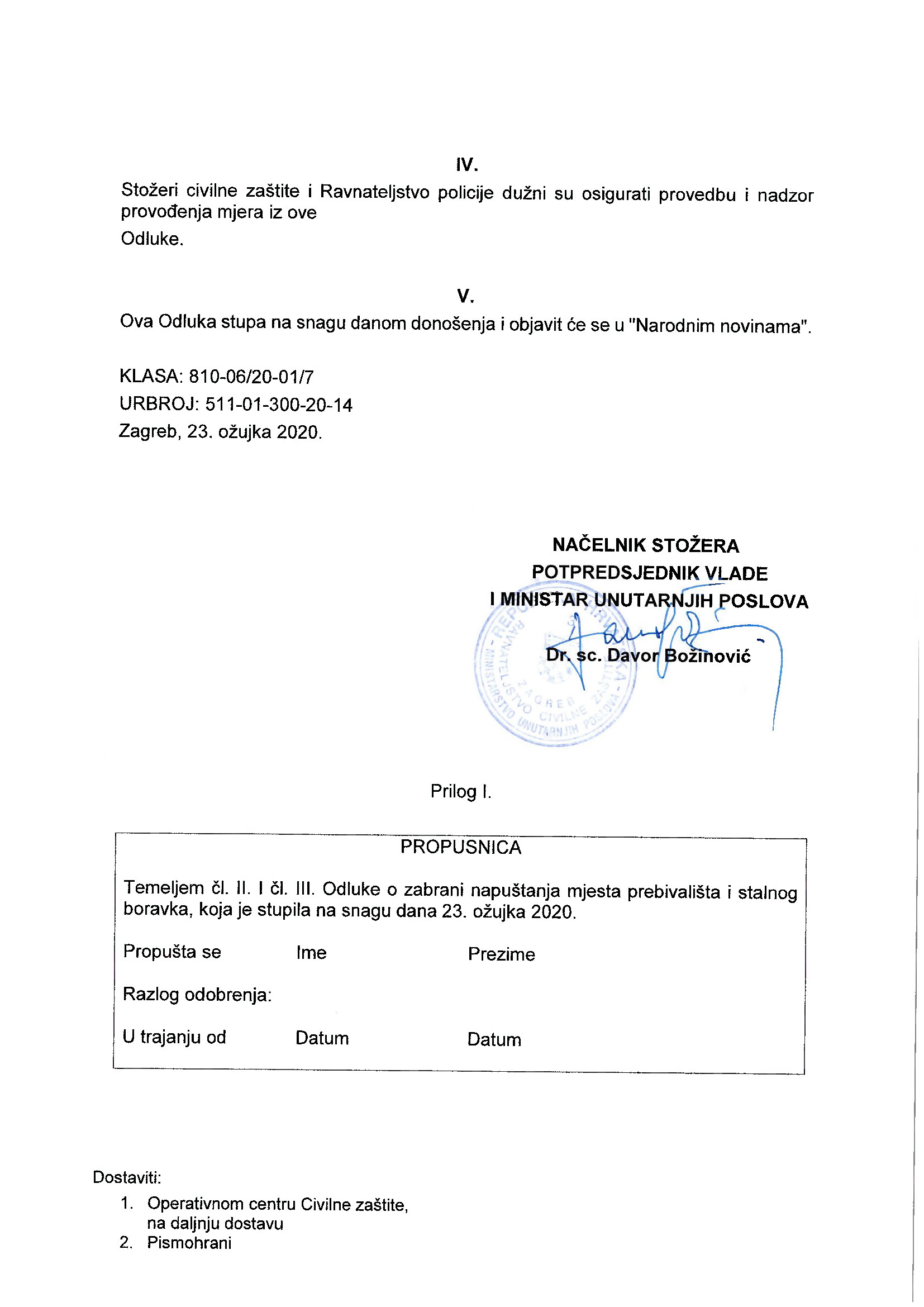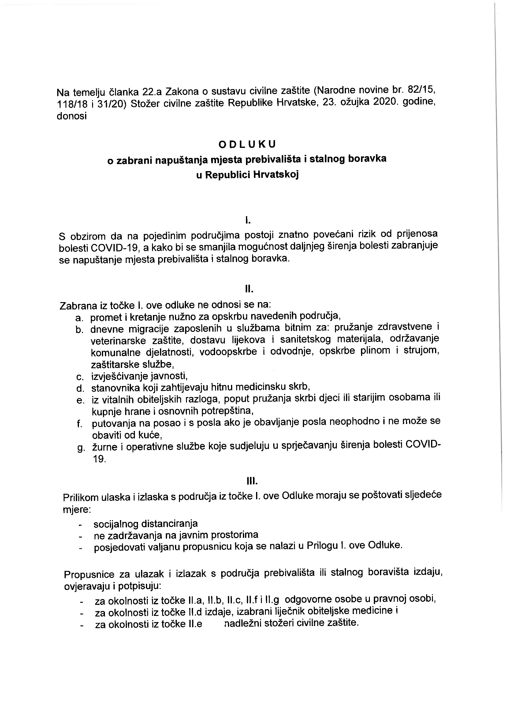 Stožer civilne zaštite Republike Hrvatske danas je donio tri odluke, a jedna od njih je Odluka o zabrani napuštanja mjesta prebivališta i stalnog boravka u Republici Hrvatskoj.