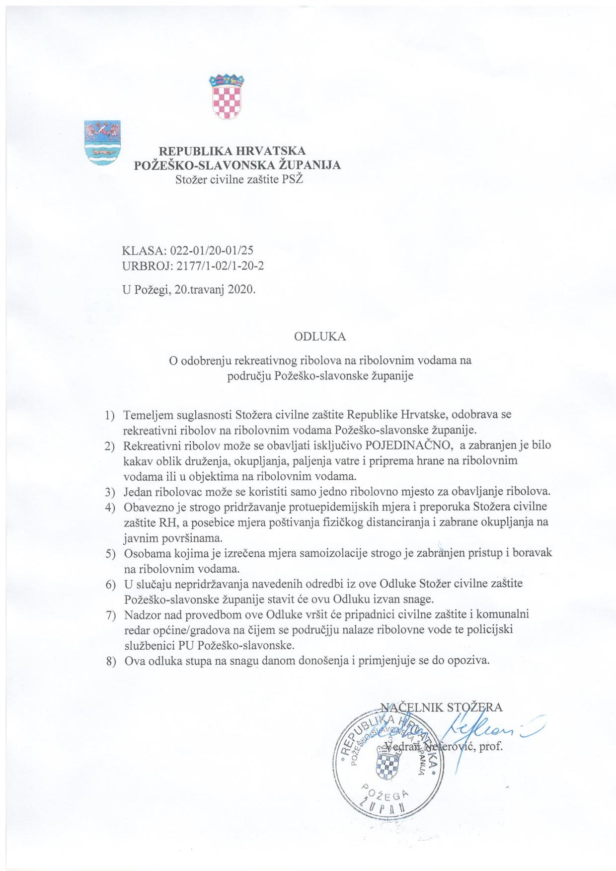 Temeljem suglasnosti Stožera civilne zaštite Republike Hrvatske, Stožer civilne zaštite Požeško – slavonske županije donio je Odluku o odobrenju rekreativnog ribolova na ribolovnim vodama na području naše županije.