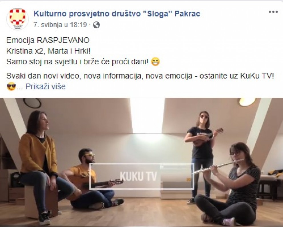 Uz slogan „Svaki dan novi video, nova informacija, nova emocija“, prošli tjedan započela je s virtualnim, ali i stvarnim radom Ku(kulturna) Ku(kućna) TV(televizija) koju su inicirali i realizirali mladi; mlade Pakračanke i Pakračani okupljeni u sekciju mladih Kulturno – prosvjetnog društva „Sloga“ Pakrac.