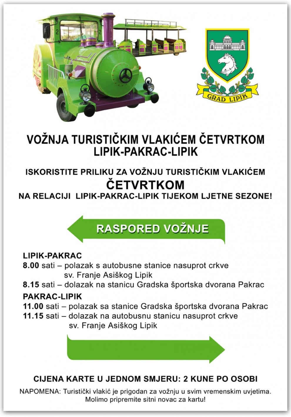 Tijekom ljetne sezone vožnja vlakićem će se održavati po cijeni od 2 kn po osobi u jednom smjeru prema sljedećem rasporedu: