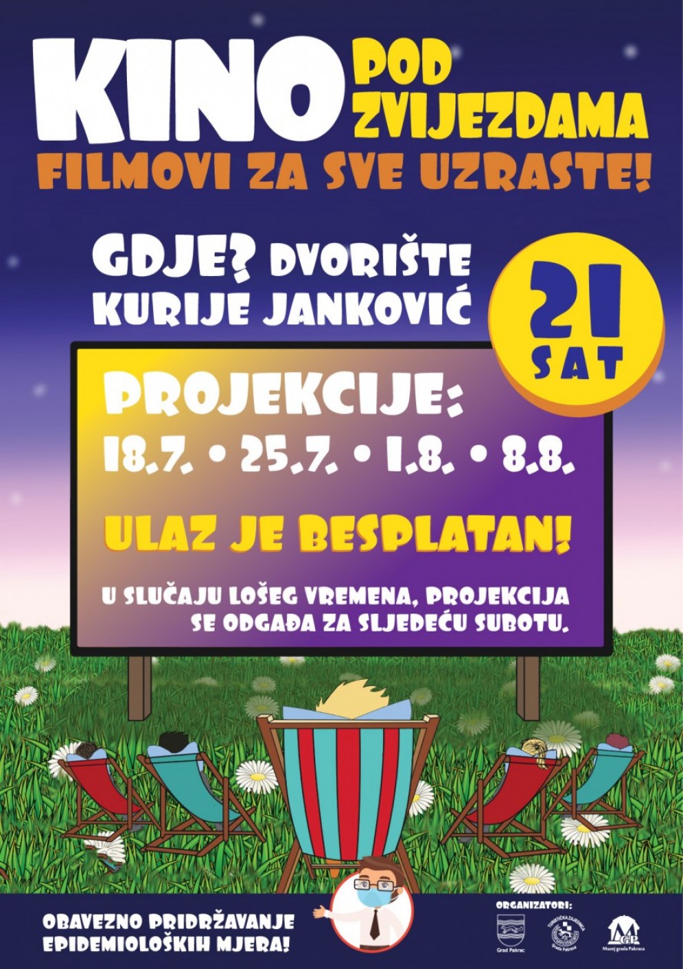 Prva projekcija slijedi već u subotu 18.7., a organizatori napominju da je obavezno pridržavanje epidemioloških mjera: nošenje maski, korištenje dezinficijensa koje će biti spremno na ulazu (kod OGŠ i Muzeja Grada Pakraca) gdje će se voditi i evidencija posjetitelja!