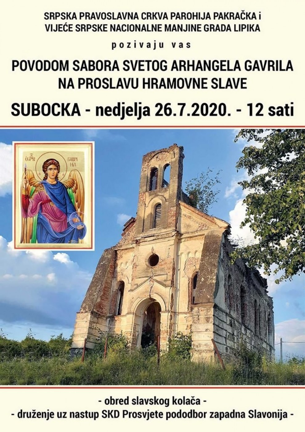 U organizaciji pakračke parohije i Vijeća srpske nacionalne manjine Grada Lipika u nedjelju, 26. srpnja u 12 sati ispred crkve Svetog arhistratiga Gavrila u Subockoj održat će se proslava hramovne slave, doznajemo od Darka Derenja, predsjednika lipičkog VSNM-a.