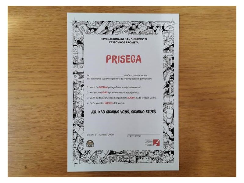 Prvi Nacionalni dan sigurnosti cestovnog prometa obilježava se pod sloganom "Kad sigurno voziš, sigurno stižeš", a cilj mu je skrenuti pozornost javnosti, pogotovo mladih ljudi, na činjenicu da su prometne nesreće ubojica broj jedan u populaciji od 10 do 25 godina. Više od stotinu ljudi godišnje ostaju trajni invalidi, a najviše su ugrožena djeca i mladi ljudi. Na hrvatskim cestama godišnje u prosjeku strada više od 15 tisuća, od čega oko 18% njih zadobije teške ozljede, dok život u prosjeku izgubi 351 osoba. Nekome su ovo samo brojke, no netko poznaje ljude koji su nastradali.