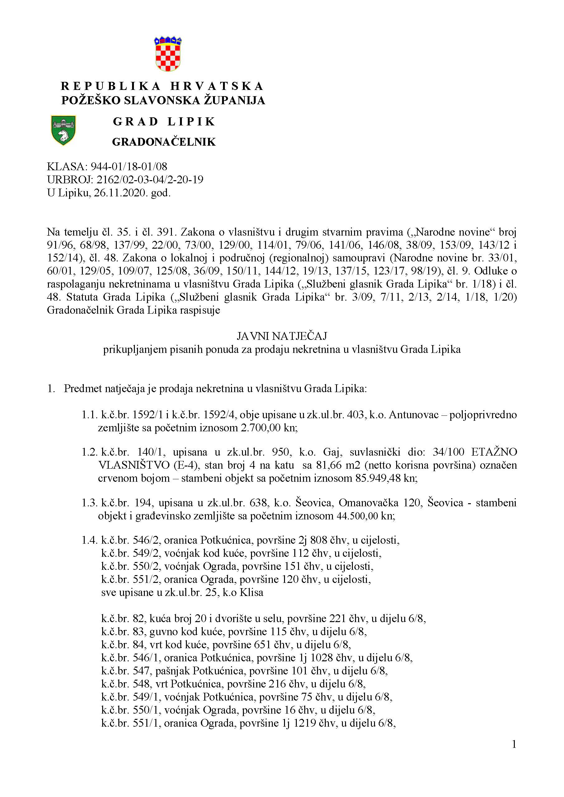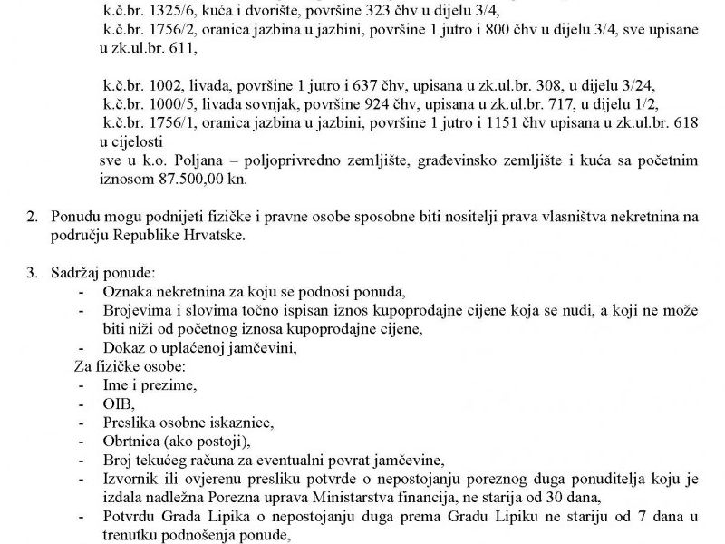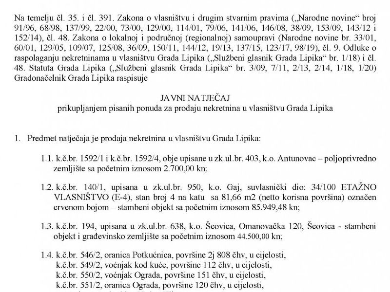 Grad Lipik je raspisao Javni natječaj za prikupljanje pisanih ponuda za prodaju nekretnina koje se nalaze u gradskom vlasništvu.