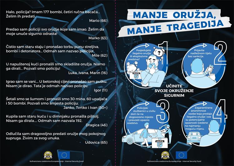 MUP najavljuje provedbu modernizirane kampanje „Manje oružja, manje tragedija“, koja je sufinancirana sredstvima Europske unije kroz Fond za unutarnju sigurnost u sklopu projekta pod nazivom „Jačanje kapaciteta MUP-a u zaštiti ljudi i kritične infrastrukture od događaja koji mogu ugroziti sigurnost, uključujući djelotvorno upravljanje rizicima i krizama koji mogu ugroziti sigurnost, te borbi protiv terorizma“.