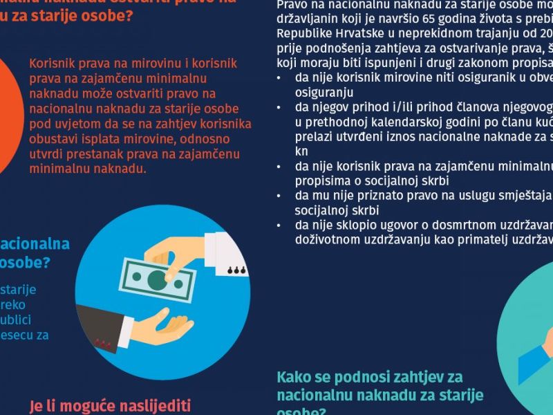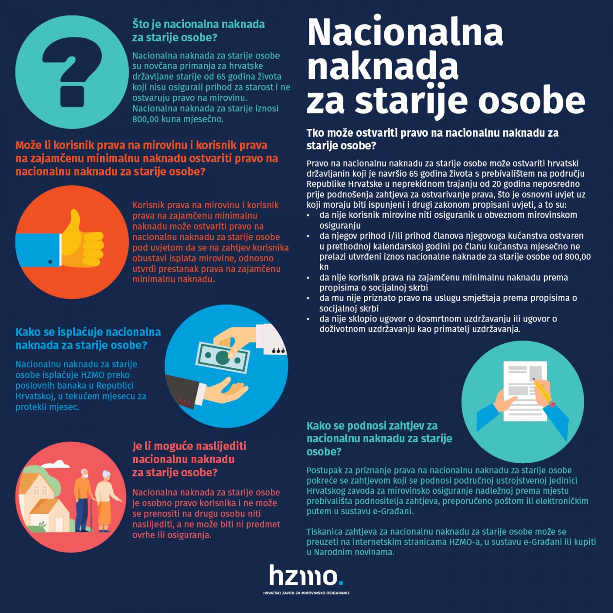 Hrvatski zavod za mirovinsko osiguranje će od utorka, 15. prosinca 2020., početi zaprimati zahtjeve za priznanje prava na nacionalnu naknadu za starije osobe, a zahtjevi će se moći predati osobno u područnoj ustrojstvenoj jedinici HZMO-a prema mjestu prebivališta podnositelja zahtjeva, preporučeno poštom ili elektroničkim putem u sustavu e-Građani. Tiskanica zahtjeva za nacionalnu naknadu za starije osobe moći će se od tog dana preuzeti na internetskim stranicama HZMO-a, u sustavu e-Građani ili kupiti u prodavaonicama Narodnih novina.