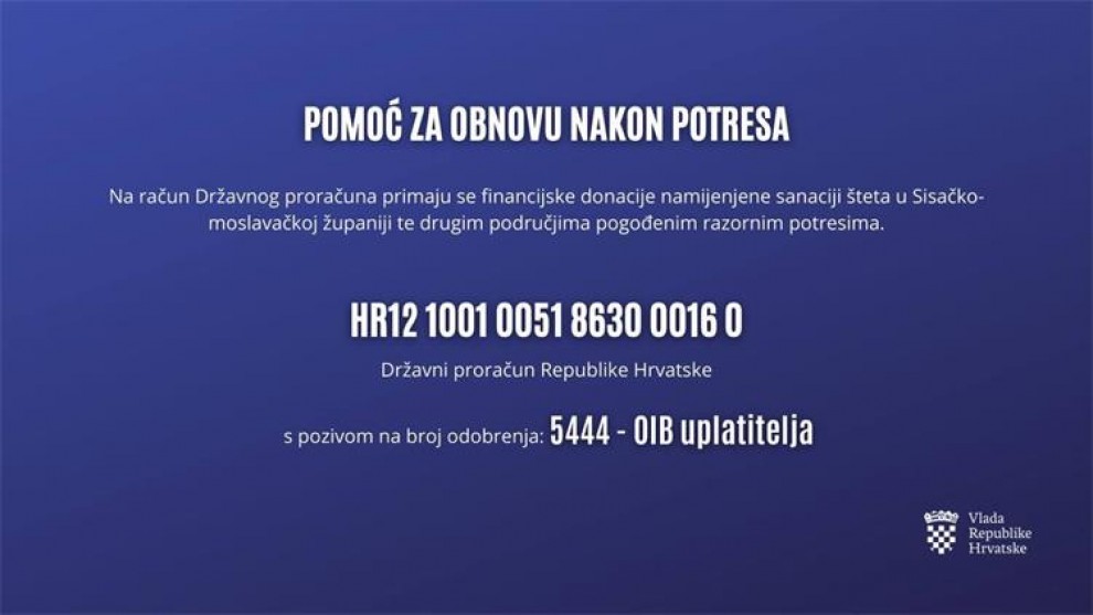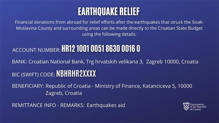 Vlada Republike Hrvatske je otvorila službeni račun Državne riznice za pomoć.