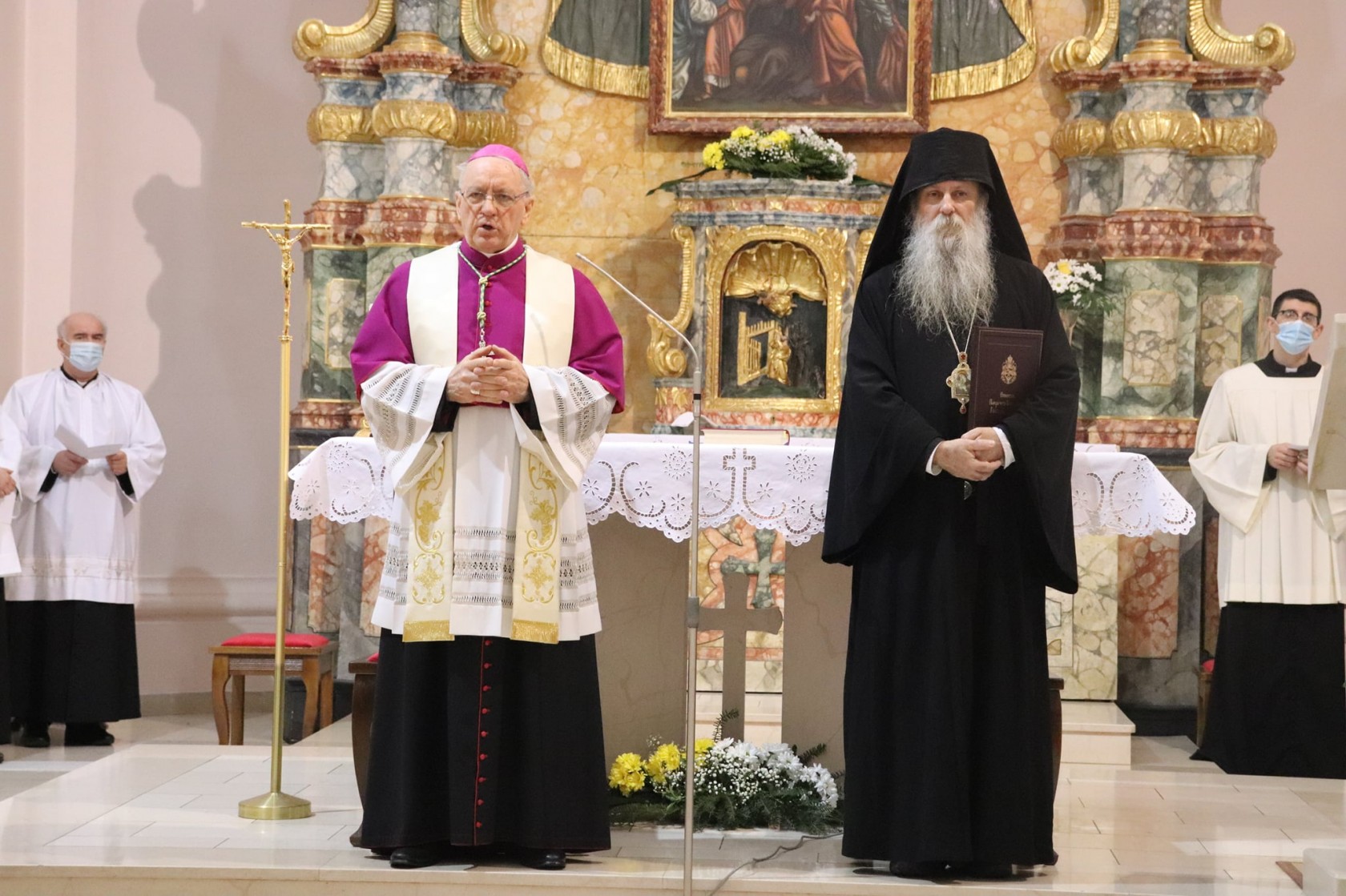 U homiliji biskup Antun je podsjetio kako je novi američki predsjednik Joe Biden prigodom nedavnog preuzimanja predsjedničke službe istaknuo da će jedan od prioriteta njegova djelovanja biti nastojanje oko jedinstva američke nacije koja je u posljednje vrijeme podijeljena do te mjere da je kod određenog dijela pristaša bivšeg predsjednika progovorila mržnja i nasilje. Ustvrdio je kako nam valja moliti da Bog pomogne onima koji se i u Hrvatskoj trude da ne bude podjela koje rađaju neslogom i upropaštavaju mnoge vrijedne pothvate. No, podsjetio je kako Isusova želja da svi njegovi učenici budu jedno, koju on tumači i u naviještenom evanđeoskom ulomku ima posebno značenje. Naime, svi mi duboko u sebi osjećamo čežnju i potrebu da budemo u skladu sa samima sobom, svojim najbližima, sa stvarnošću oko sebe, s Bogom, ustvrdio je biskup. Kao Božja stvorenja svi smo međusobno braća, kako nam poručuje papa Franjo i u svojoj najnovijoj Enciklici »Tutti fratelli«. No, međusobno smo različiti i drugačiji, i to počesto postaje uzrok podjela i sukoba. Premda razumski možemo sebi protumačiti da onaj tko je drugačiji od nas nije nam zbog toga protivnik, nego kao posebna, jedinstvena i neponovljiva osoba svjedoči bogatstvo Božjeg života, po kojem nismo kopije ni klonove, nego njegovi originali, ipak ne uspijevamo uvijek jedni druge prihvaćati kao braću. Činjenica da smo svi Božja stvorenja i da smo svi po Bogu jedno i braća pomućena je našom ranjenošću zlom i grijehom, koji nas rastače i stvara nesklad u našem biću, a u međusobnim odnosima očituje se u razdorima i svađama. Na to nas podsjeća sv. Pavao u naviještenom ulomku iz Prve poslanice Korinćanima. Apostol smatra važnim jedinstvo Korinćana te ih zaklinje da budu iste misli i osjećaja, uvjeravajući ih da se to može ostvariti samo ako sebe ne smatraju Pavlovima, Apolonovima ili Kefinima, nego Kristovima. Naime, moć Isusove ljubavi s križa jedina je kadra stvoriti istinsko jedinstvo u nama i s drugima oko nas, istaknuo je biskup. Kazao je da radi toga i na ovom večerašnjem slavlju valja zajednički i pojedinačno postaviti Pavlovo pitanje: »Zar je Krist razdijeljen?« Nastupamo li tako da se najprije nazivamo katolicima, pravoslavcima ili protestantima, umjesto da prije svega govorimo da smo Kristovi i da se tako ponašamo? Upozorio je: ako Isus Krist nije u nama Božja moć koja nas ozdravlja od razbijenosti grijehom i povezuje s drugima, ostat ćemo u nemoći svoga neskladnog bića i svojih podjela. Upozorio je kako biskupi, svećenici i drugi vjernici ne bi smjeli biti hladni i ravnodušni na Isusovu želju za jedinstvom njegovih učenika, te bi trebali to očitovati i sudjelovanjem na ekumenskim slavljima tijekom Molitvene osmine za jedinstvo kršćana po kojima svjedočimo da je Isus Krista središte života naših Crkava i kršćanskih zajednica, da je njegova želja i naša želja, a njegovo djelovanje i naše djelovanje.