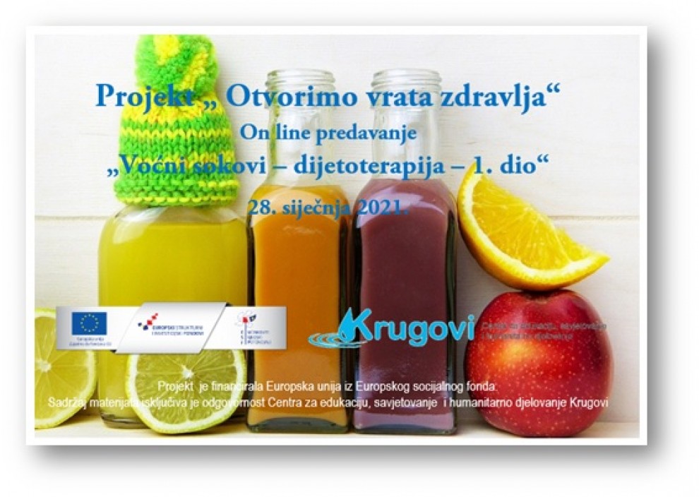 U sklopu projekta „Otvorimo vrata zdravlja“, u četvrtak, 28. siječnja u 18:30h održat će se prvi dio online predavanja o dijetoterapiji voćnim sokovima. Predavanje će održati nutricionist Dragan Gazibara koji iza sebe ima višegodišnje radno iskustvo u Odjelu prehrane i usluživanja s dijetetikom u Daruvarskim toplicama, rad s pacijentima s posebnim prehrambenim potrebama, rad s profesionalnim sportašima i rekreativcima, djecom, trudnicama i osobama starije životne dobi.