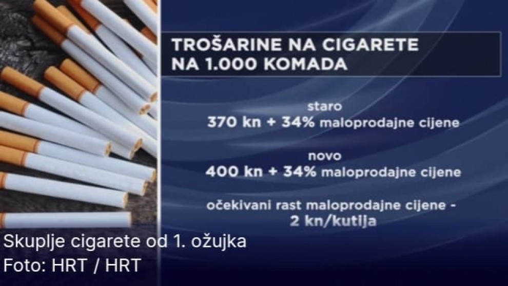 Najava poskupljenja cigareta i ostalih duhanskih proizvoda kod pušača je očekivano izazvala nezadovoljstvo. Trošarine na cigarete dosad su iznosile 370 kuna plus 34% od maloprodajne cijene na tisuću komada, a od 1. ožujka to se povećava na 400 kuna plus 34% od maloprodaje. Ta maloprodajna cijena mogla bi porasti za 2 kune po kutiji. Stručnjaci kažu da se potrošnja duhanskih proizvoda neće smanjiti jer za njih ne postoji odgovarajuća zamjena. No smatraju da promjene moraju ići u drugom smjeru.