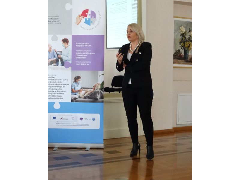 Predavanje je održala univ. spec. iur. Silvija Dološić iz Osijeka, predsjednica i osnivačica Udruge Memoria, udruge za pomoć u ostvarivanju ljudskih prava starijih osoba oboljelih od Alzheimerove bolesti.