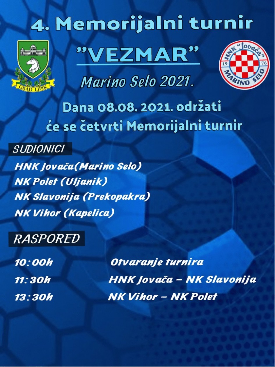 U organizaciji HNK „Jovača“ Marino Selo i pod pokroviteljstvom Grada Lipika u nedjelju, 8. kolovoza na nogometnom igralištu u Marinom Selu, održat će se Memorijalni turnir „VEZMAR“, posvećen osnivačima kluba, poginulim igračima HNK „Jovača“ u Domovinskom ratu i tragično preminulima.
