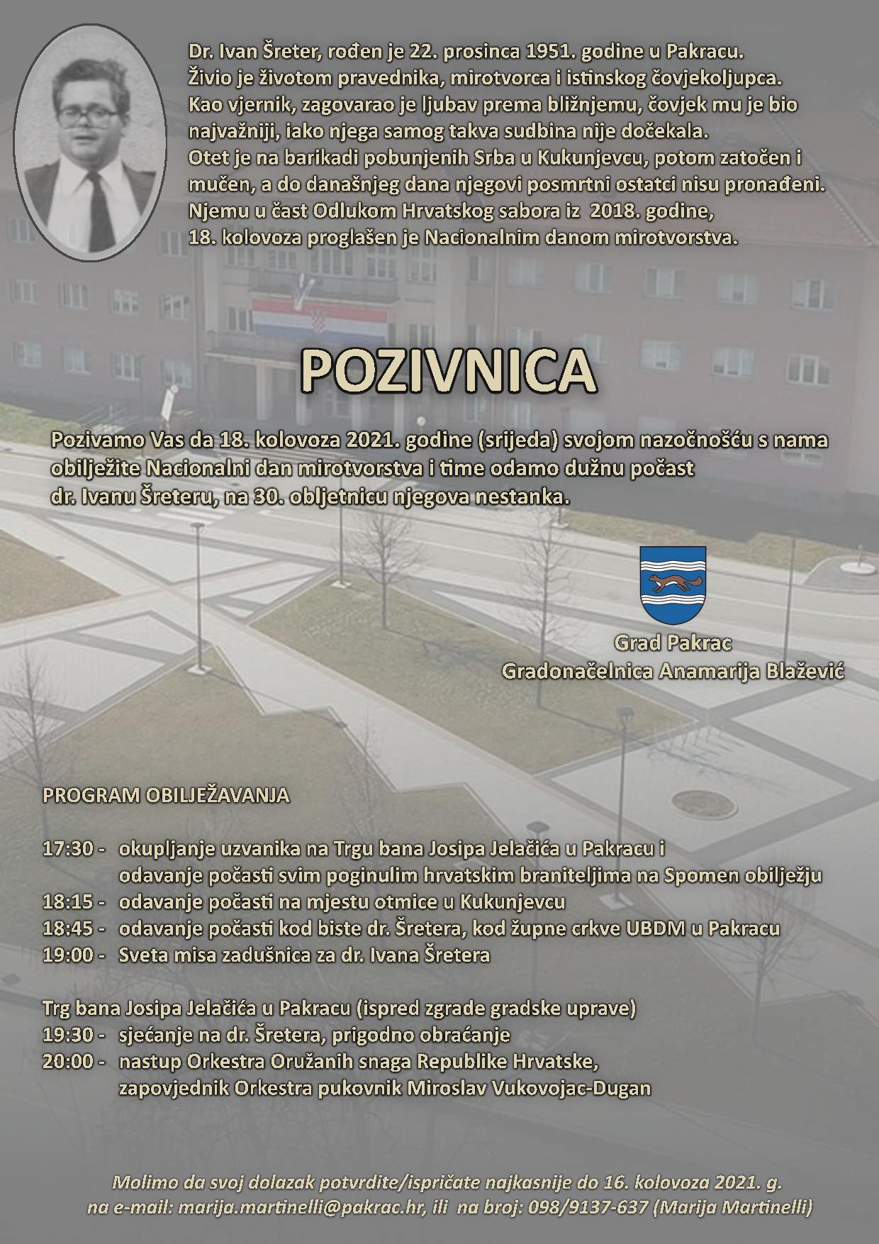 Povodom Nacionalnog dana mirotvorstva i Dana sjećanja, koji se obilježava upravo 18. kolovoza, održat će se komemorativno sjećanje na dr. Ivana Šretera, na njegovu žrtvu i njegov doprinos za slobodnu i neovisnu Hrvatsku te na sve ono što je kao čovjek i liječnik postigao.