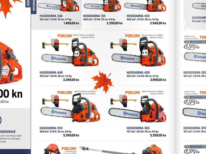 Jednu od najprodavanijih motornih pila Husqvarna 365 (70 cm3, 3,6kW, 45 cm, 6,4kg) po cijeni od 5.299 kn, a uz koju se prilikom kupnje dobije poklon sjekira i rukavice ukupne vrijednosti 630kn.