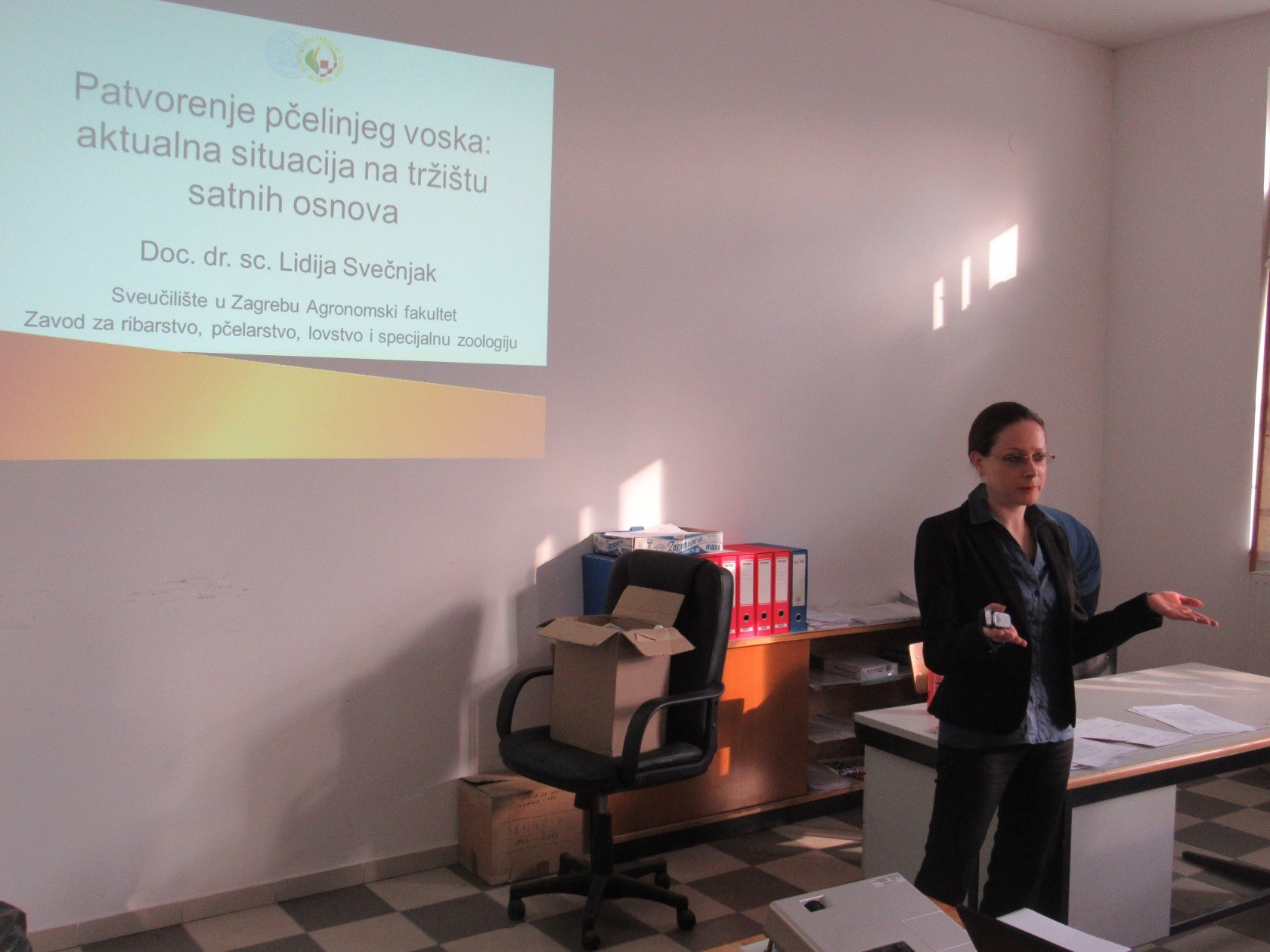 Prvo predavanje na temu „Patvorenje pčelinjeg voska: aktualna situacija na tržištu satnih osnova“ održala je profesorica s Agronomskog fakulteta Sveučilišta u Zagrebu doc.dr.sc. Lidija Svečnjak. Uz predavanje doc.dr.sc. Lidija Svečnjak predstavila je domaćim pčelarima iz Pakraca i Lipika rezultate provedene analize uzoraka satnih osnova i pčelinjeg voska od 14 pčelara iz udruge koji su prethodno poslali svoje uzorke na analizu u Zagreb. Nakon provedene analize pronađeni su tragovi parafina, što ukazuje na patvorenje, u uzorcima pčelara iz udruge koji su svoje satne osnove nabavljali u Bosni i Hercegovini, doznali smo od Roberta Androića, predsjednika Udruge pčelara Pakrac-Lipik. Domaći pčelari između ostalog poslušali su savjete i upozorenja stručnjaka na što trebaju obratiti pozornost pri nabavci satnih osnova kako bi ubuduće izbjegli patvoreni pčelinji vosak.