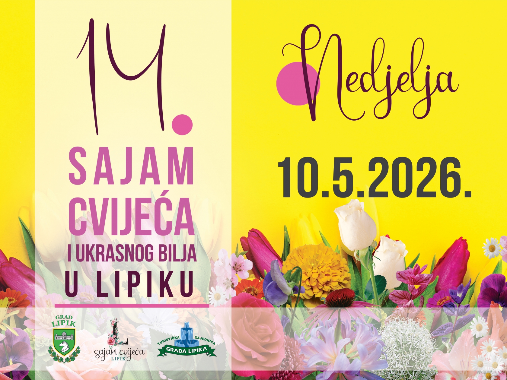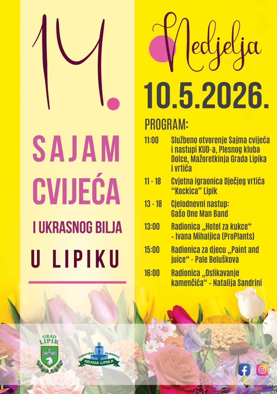 Druga nedjelja u svibnju u Lipiku tradicionalno je rezervirana za jednu od najljepših manifestacija u našem kraju. U nedjelju, 10. svibnja, održat će se 14. Sajam cvijeća i ukrasnog bilja, koji i ove godine donosi bogat program ispunjen glazbom, kreativnošću i tradicijom.
