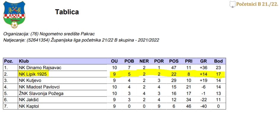 Početnici (U-11) pod vodstvom Dražena Bahnika i pred kraj sezone uz pomoć Miroslava Leovca nastupaju u 1. ŽNL PSŽ, skupina B. Najveći dobitak ove kategorije je brojka igrača koja se s početnih dvadesetak podigla na 34, a svakim treningom gotovo da se pojavi novi igrač. Osim službenih utakmica u kojima bilježe pet pobjeda, dva neodlučena rezultata i dva poraza te s time zauzimaju drugo mjesto, odigrali su i niz prijateljskih utakmica (Psunj Sokol Okučani, Daruvar) kako bi svi dobili određenu minutažu.