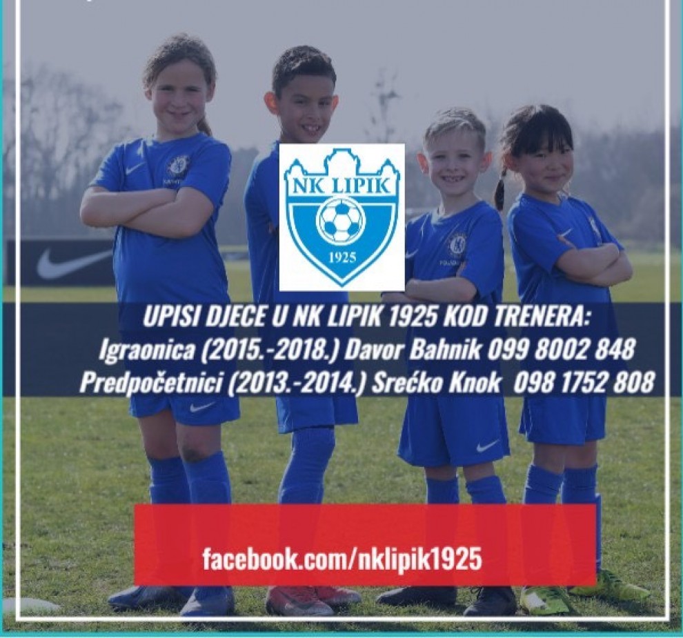 Nogometni klub Lipik 1925 vrši upise u školu nogometa kod trenera Davora Bahnika (099 8002 848) i Srećka Knoka (098 1752 808), a zainteresirani se mogu javiti putem Facebook Messengera ili putem e-maila: nklipik1925@gmail.com.