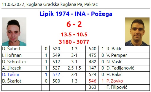 U domaćoj ekipi pojedinačne poene su osvojili I. Hofman 549, D. Schrotter 512, A. Jirasek 527 i D. Tušim 572 te je ekipa osvojila dva poena na više oborenih čunjeva. Utakmica je bila prosječna i bez rezultatskog naboja u opuštenoj atmosferi, a igrač lige je zasluženo Domagoj Tušim, mladi kuglač KK „Lipik 1974“.