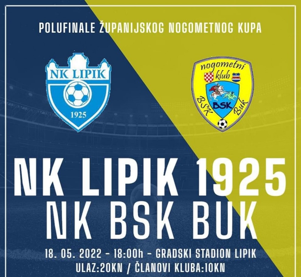 Utakmica između lipičke momčadi i gostujućeg Buka počinje u 18 sati na stadionu u Lipiku. Drugi polufinalni par je Jakšić - Požega. Finale se održava 8. lipnja u Jakšiću, a pobjednik ostvaruje plasman u Hrvatski nogometni kup.