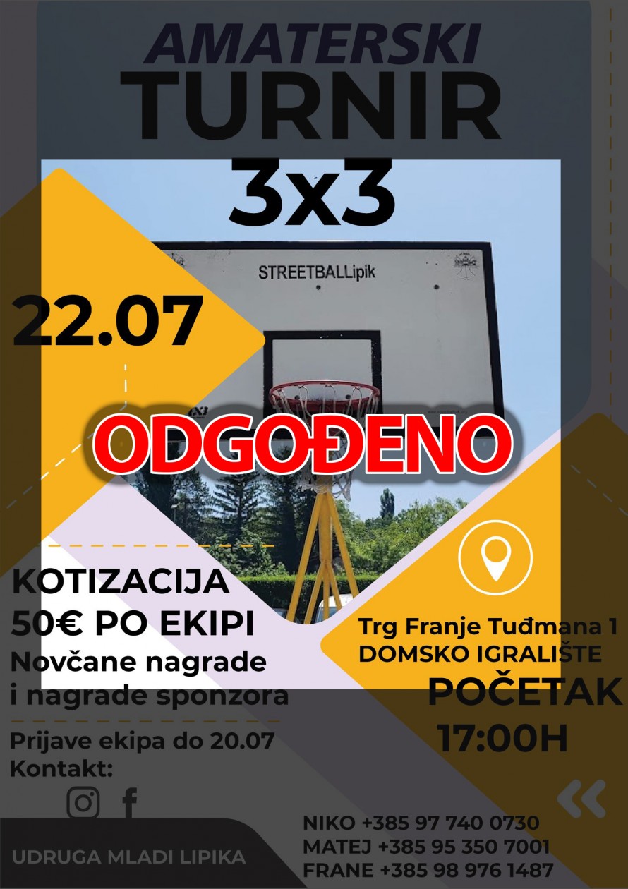 Amaterski 3X3 turnir u košarci najavljen za petak i subotu (21. i 22. srpnja) je odgođen, a novi termin igranja bit će uskoro određen.